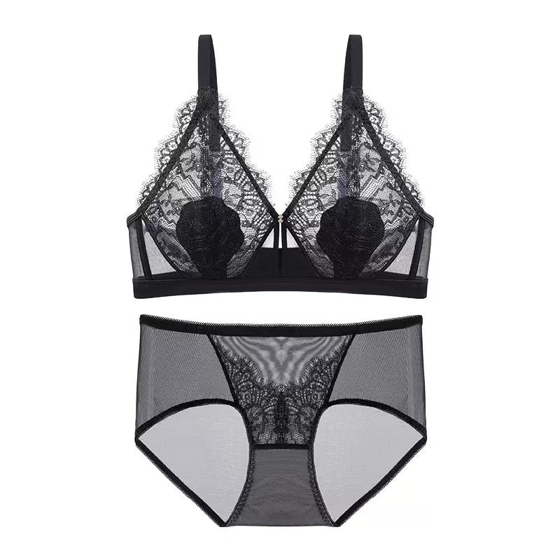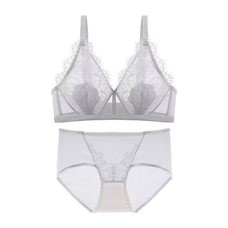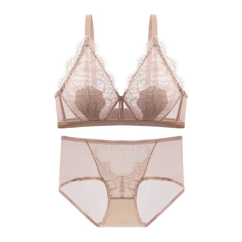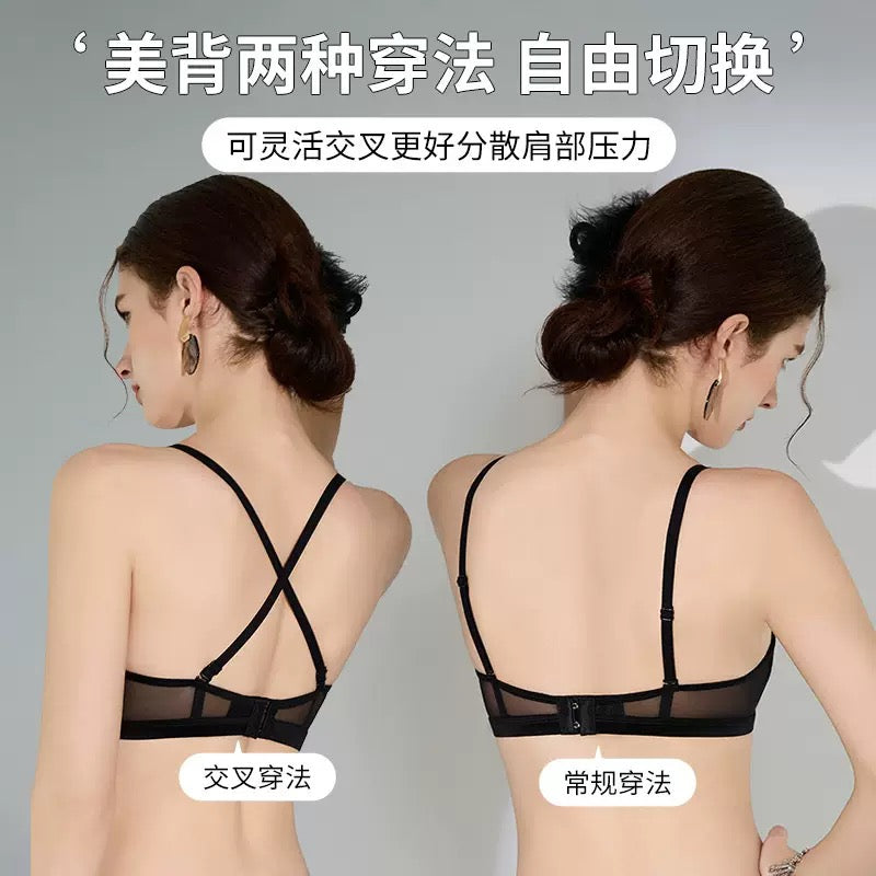 French-style Lace Backless Bra Set for Women - Minimizing Full-Coverage Deep V Sheer Lingerie