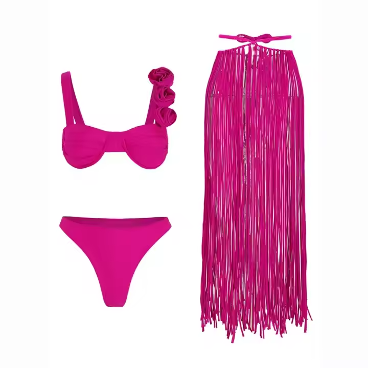 Pink Weave Rope Sexy 3D Flower Bikini 3 Piece Swimwear Solid Color Tassel Bathing Suit